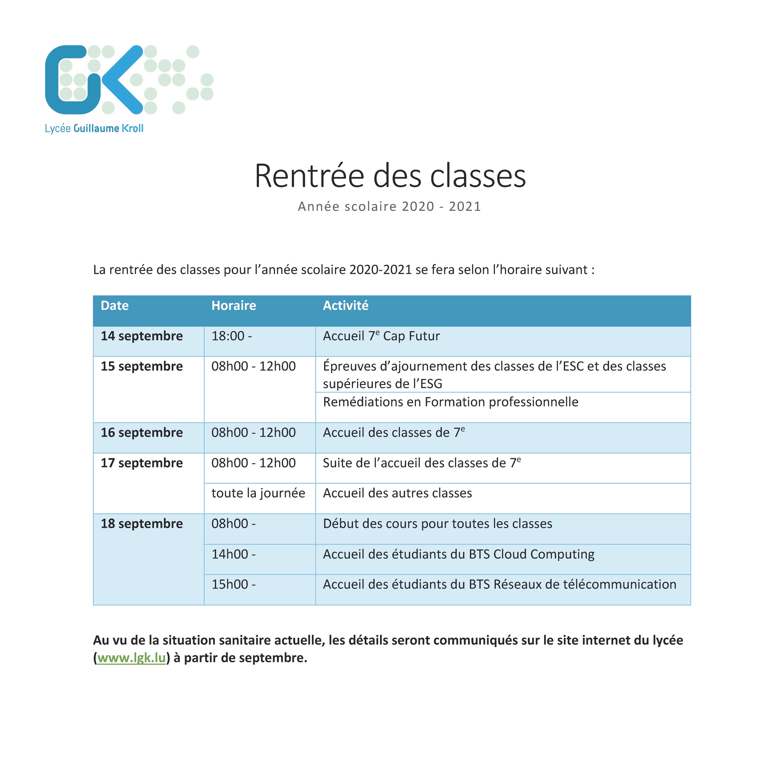 Voici les informations importantes sur la rentrée des classes 2020 – 2021!